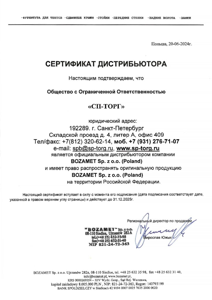 Являясь официальным дилером польского производителя BOZAMET, мы гарантируем высочайшее качество наших товаров, которые соответствуют всем международным стандартам. Этот опытный и уважаемый производитель специализируется на производстве элементов тентов, кузовов и комплектующих для грузовых автомобилей, что обеспечивает нашим клиентам отличное соотношение цены и качества.