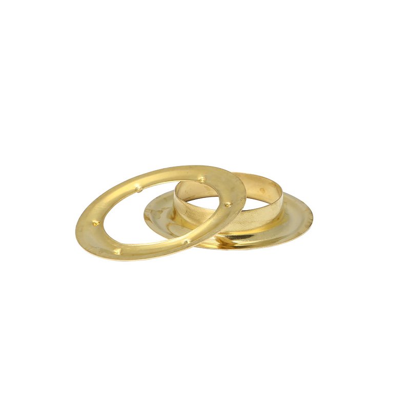 Люверс круглый латунный диаметром 16 мм защищает крепежные отверстия на тентах и мягких окнах от растяжения и разрывов. Состоит из двух колец, которые зажимаются специальным инструментом и крепко держатся на материале. Изготовлен из латуни, поэтому имеет характерный желтый цвет. Материал устойчив к коррозии и УФ-лучам, что позволяет использовать латунные люверсы при любой погоде.