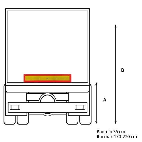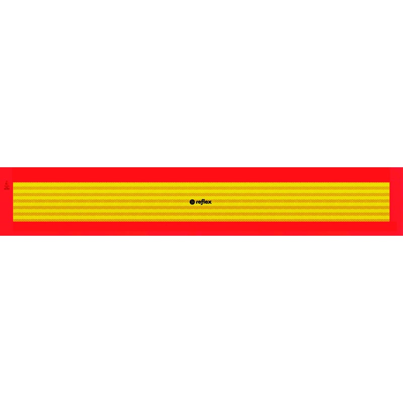 Знак ТСБД выполнен в виде горизонтальной желтой полосы в рамке красного цвета. Имеет размеры 1130х190х1, закрепляется на задней части длинномерного грузовика, прицепа, полуприцепа. Поверхность знака имеет микропризматическую структуру, отражает свет фар, из-за чего участники движения различают машину даже в условиях плохой видимости. Основа знака выполнена из алюминия, что обеспечивает износостойкость и долгий срок эксплуатации.